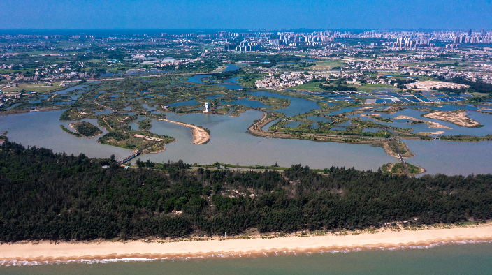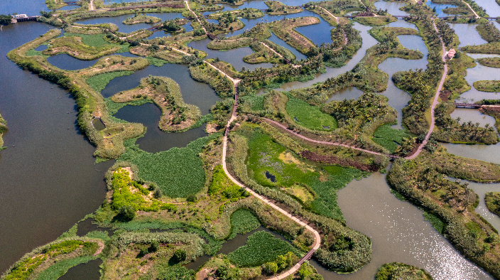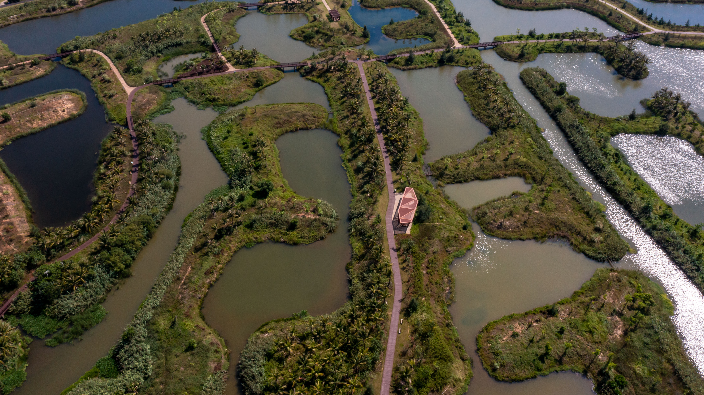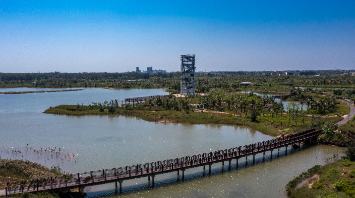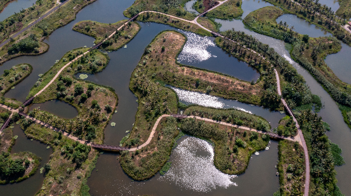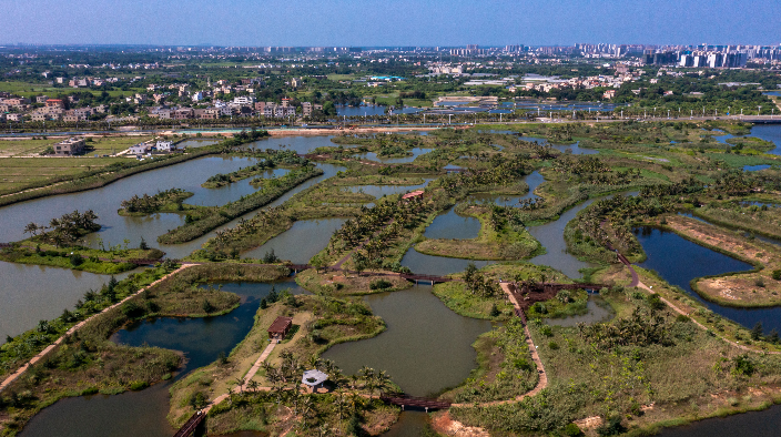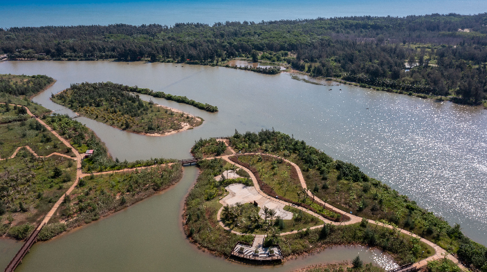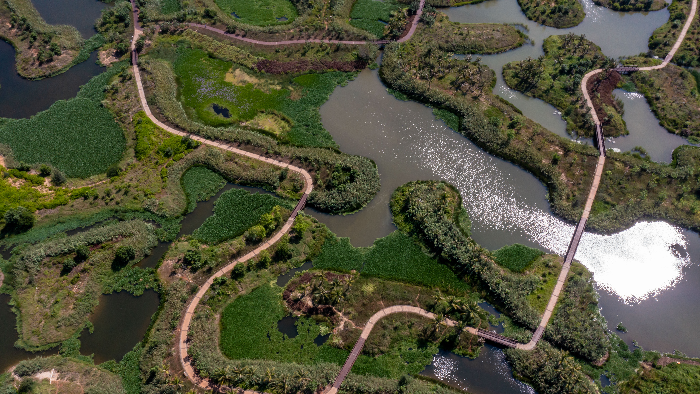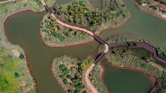 В парке водно-болотных угодий реки Майя в новом районе Цзяндун города Хайкоу было завершено строительство нескольких новых объектов: дорожки из деревянного настила, экологического пешеходного коридора, «экологической станции» и смотровой башни для наблюдения за птицами. Воды отделяют растения водно-болотных угодий друг от друга, и мангровые деревья, кокосовые пальмы, «деревья судьбы» (лат. Clerodendrum inerme) и другие растения свободно колышутся на ветру.