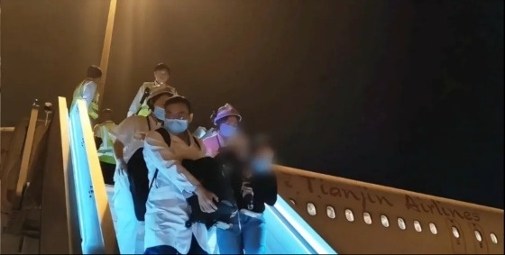 Профессор Ма Мингуан, руководитель Центра хронических лёгочных заболеваний Хайнаньской современной больницы матери и ребёнка, вместе с однолетним пациентом из Монголии и его семьёй спускаются с трапа самолёта, аэропорт Мэйлань. Фото: Хуан Дунгуан / корреспондент.