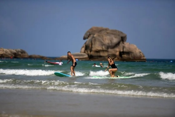 Туристы занимаются серфингом в деревне Хоухай, г. Санья (фото из архива). Фото: Ша Сяофэн / корреспондент.