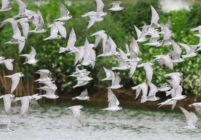 Белокрылые болотные крачки парят в воздухе словно «падающие снежинки», Дунчжайган. Фото: Лу Ган.