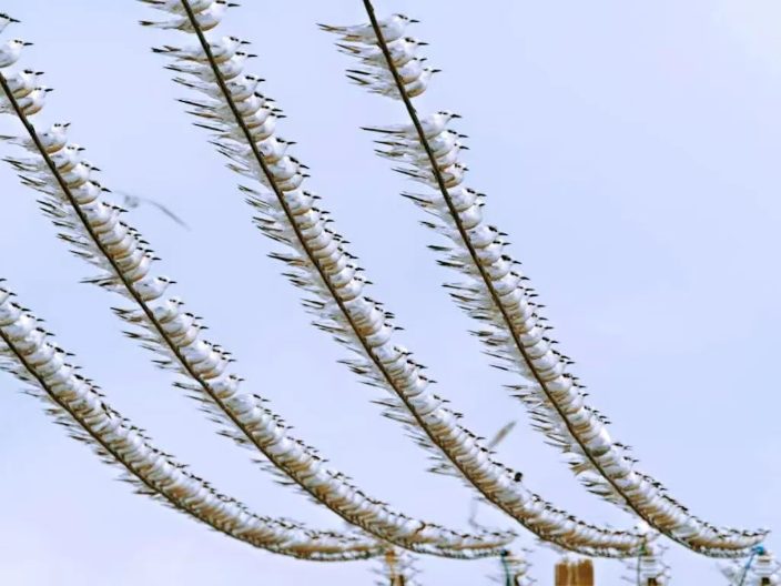 Белокрылые болотные крачки сидят на проводах словно «свисающие ледяные сосульки», Дунчжайган. Фото: Лу Ган.